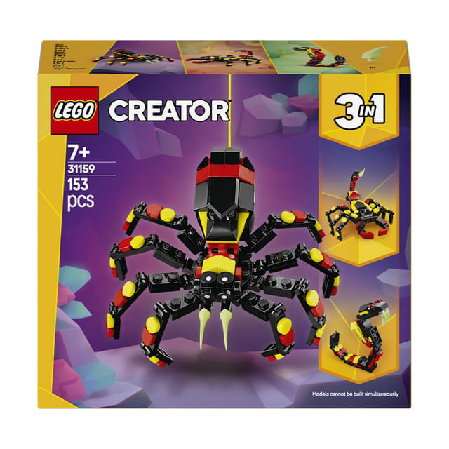 • 3 animale salbatice intr-o cutie – Jucaria LEGO® Creator Animale salbatice: Paianjen surprinzator ofera ocazia copiilor de 7 ani si mai mari sa construiasca si sa reconstruiasca 3 figurine animale diferite cu aceleasi caramizi;