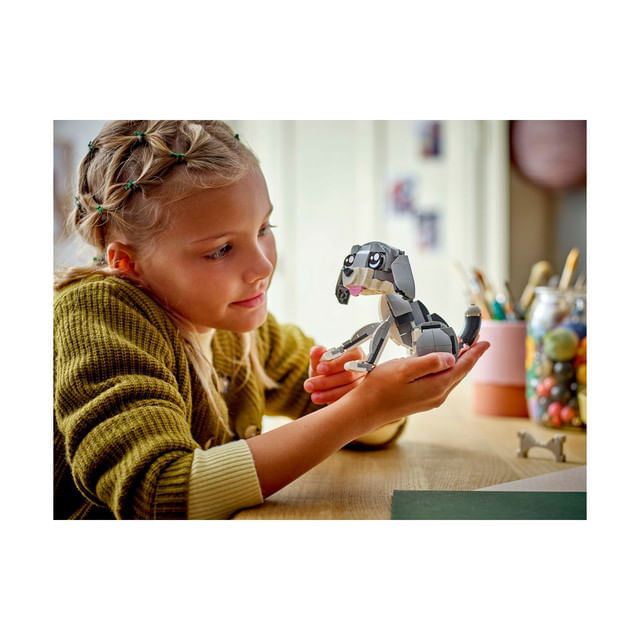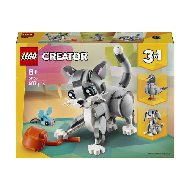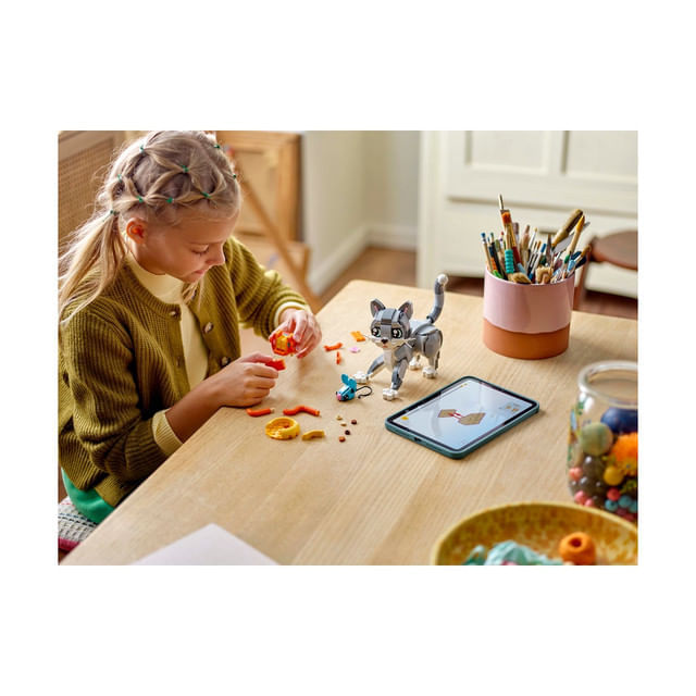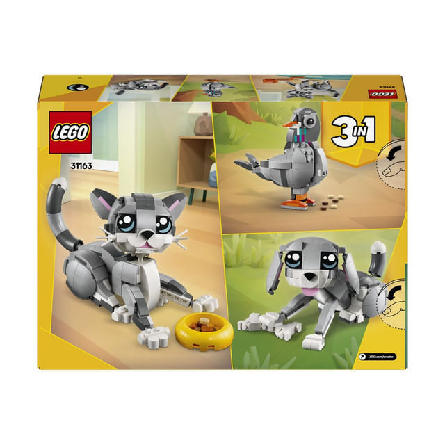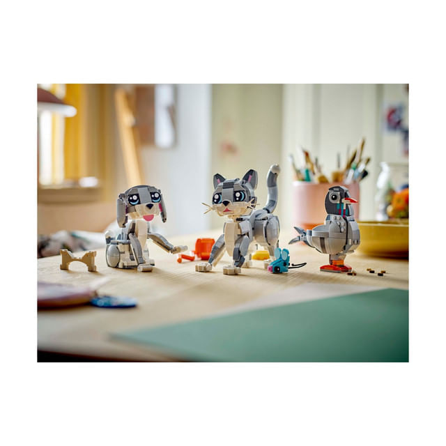 Fetele si baietii pot construi 3 animale LEGO diferite cu aceleasi caramizi: o pisica articulata care poate sta asezata, poate sta in picioare si poate sari; un caine adorabil si articulat cu un os; si un porumbel cu firimituri de paine. Toate cele 3 scene fac din acest set un cadou LEGO grozav pe care copiii il pot etala si cu care se pot bucura de joaca fantezista.