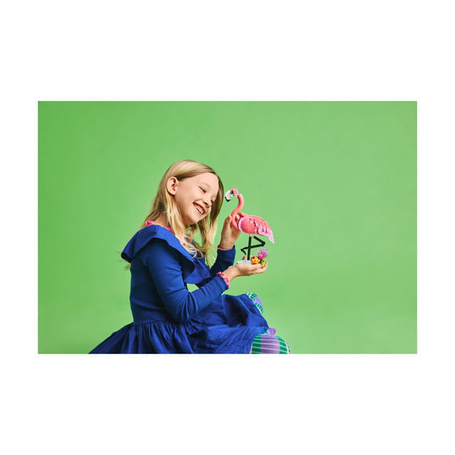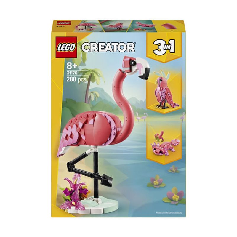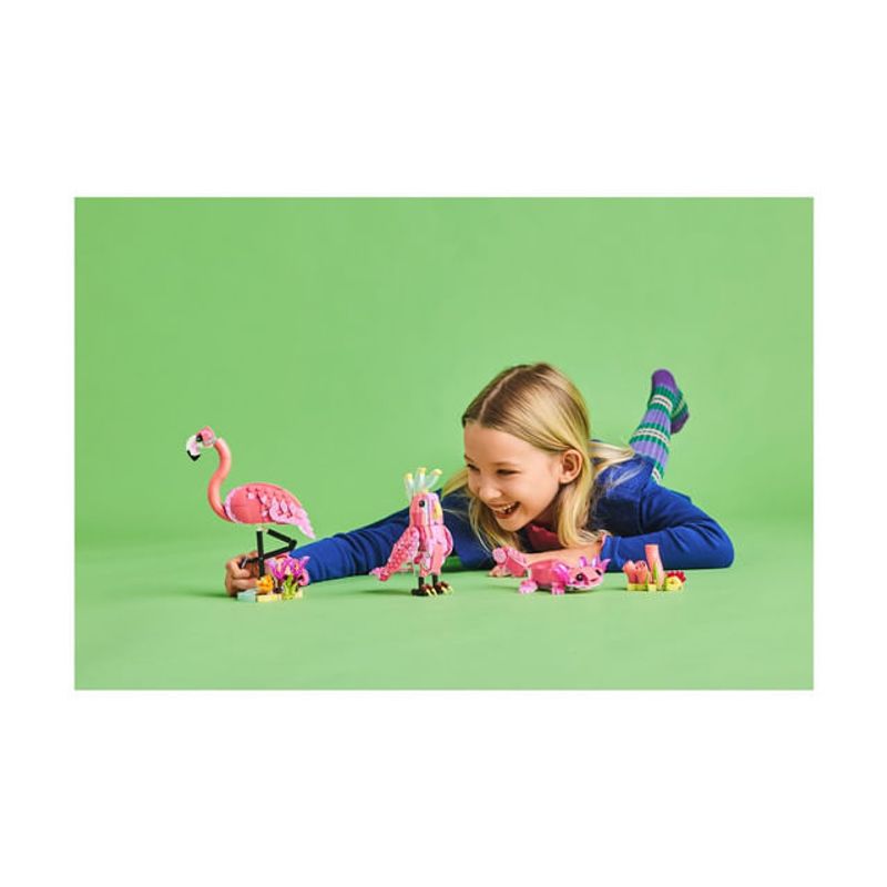 Acest set LEGO ofera copiilor 3 optiuni diferite de constructie folosind aceleasi caramizi: un flamingo roz cu capul articulat, aflat pe un suport acoperit cu plante, un papagal roz articulat care isi poate roti capul cu 360 de grade sau un adorabil axolotl roz cu plante subacvatice. Toate cele 3 animale LEGO transformabile reprezinta cadouri distractive pentru copii.
