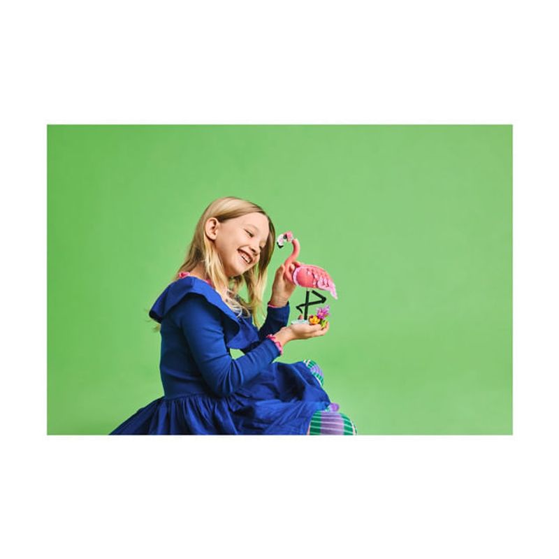 • Nenumarate optiuni de joaca – Copiii pot interpreta pe roluri povesti cu 3 modele diferite de animale (ia aminte ca modelele nu pot fi construite simultan): un flamingo roz, un papagal roz sau un axolotl roz.