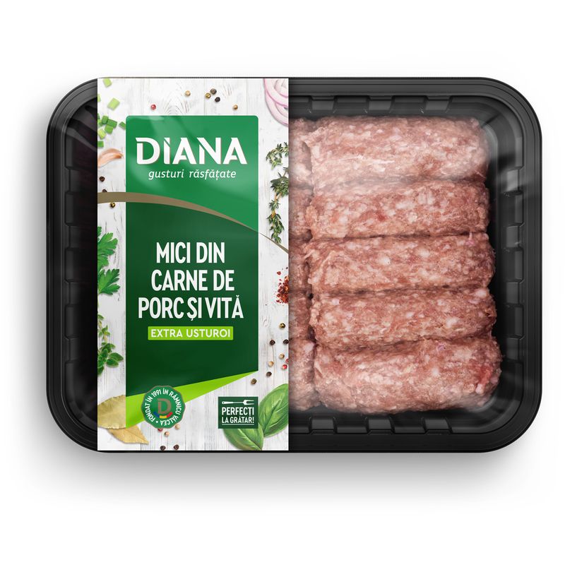 Adevaratii fani ai mititeilor stiu sa recunoasca un preparat de calitate. Gustul, savoarea si prospetimea fac diferenta. Iar cu mici Diana de porc-vita cu usturoi, 1 kg, ai certitudinea ca gratarul tau va fi intotdeauna unul reusit. Pe langa faptul ca sunt produsi din carne de cea mai buna calitate, micii sunt condimentati cu extra usturoi. Cantitatea suplimentara de usturoi adaugata in compozitia micilor ii face sa fie mult mai gustosi decat in varianta clasica.