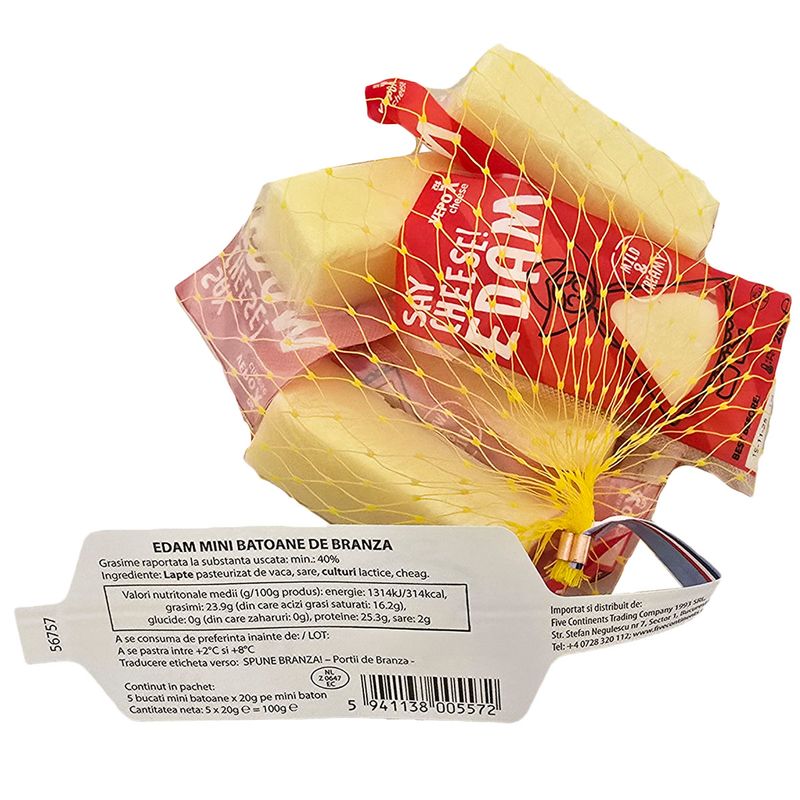 Mini portii de branza Edam ambalate intr-o plasa numai bune pentru o gustare sanatoasa, una pentru fiecare zi a saptamanii!