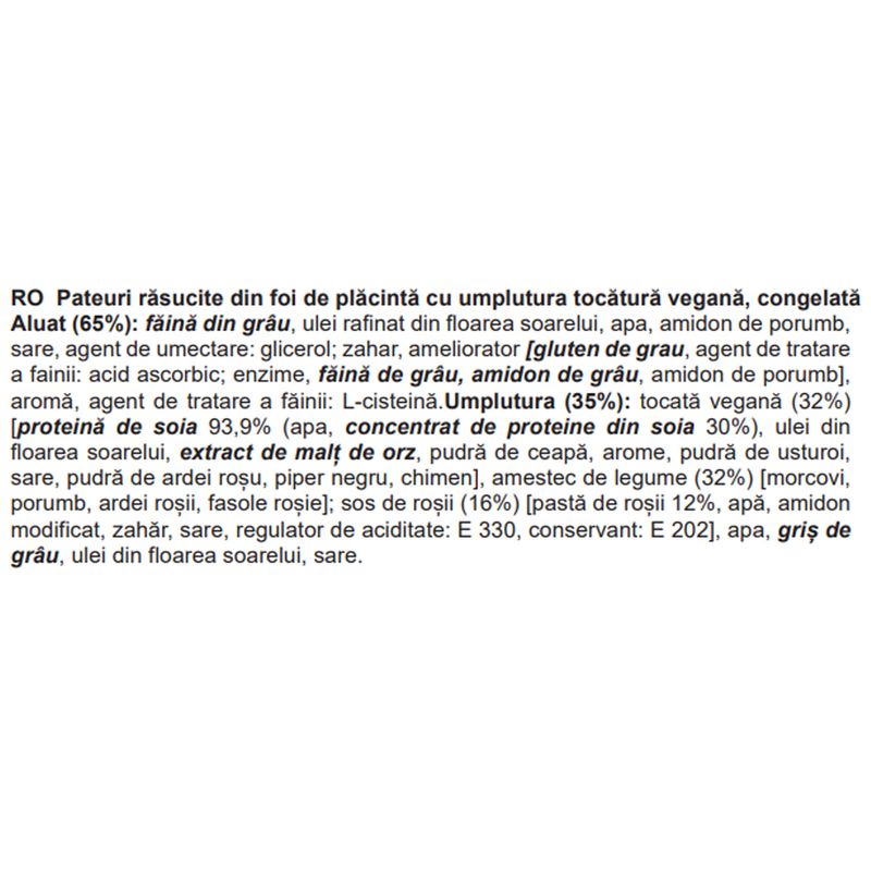 Aluat (65%): faina de grau, ulei rafinat de floarea soarelui, apa, amidon de porumb, sare, umectant: glicerol; zahar, ameliorator [gluten de grau, agent de tratare a fainii: acid ascorbic; enzime, faina de grau, amidon de grau, amidon de porumb], aroma, agent de tratare a fainii: L-cisteina.Umplutura (35%): carne tocata vegana (32%) [proteina din soia 93,9% (apa, concentrata proteina din soia 30%), ulei de floarea soarelui, extract de malt de orz, praf de ceapa, arome, pudra de usturoi, sare, pudra de ardei rosu, piper negru, chimen], amestec de legume (32%) [porumb, ardei rosu]; sos de rosii (16%) [piure de rosii 12%, apa, amidon modificat, zahar, sare, regulator de aciditate: E 330, conservant: E 202]; apa, gris de grau, ulei de floarea soarelui, sare.Poate contine urme de susan, oua, nuci si lapte.