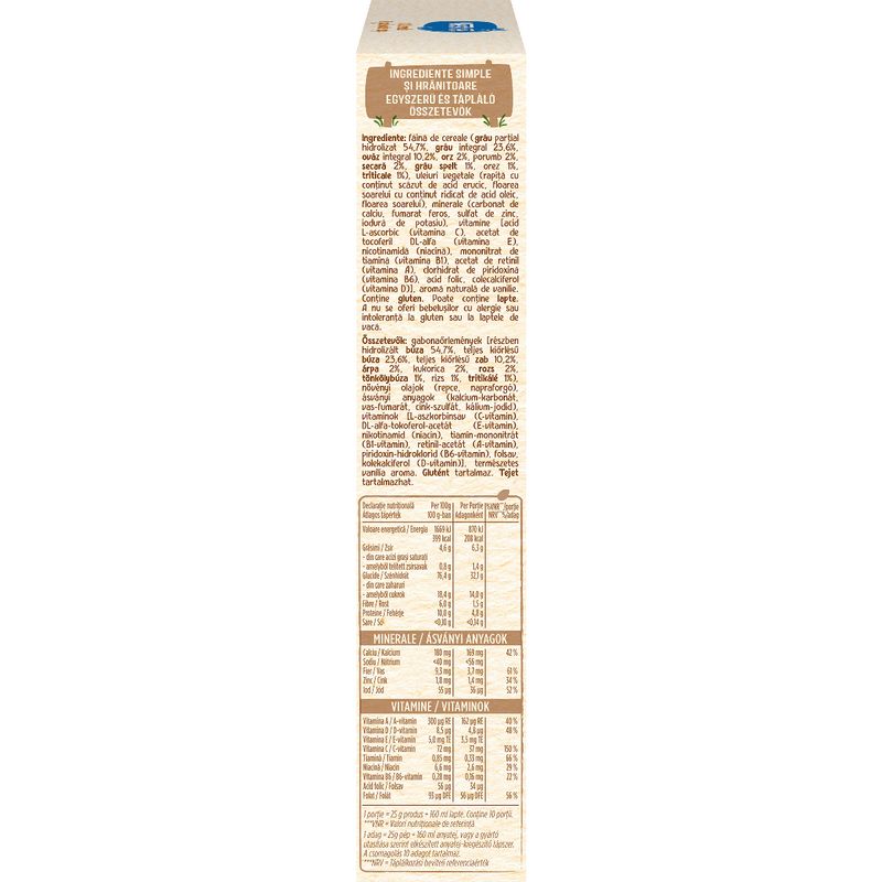 Ofera-i puiului tau o masa delicioasa cu cereale imbogatite cu nutrienti esentiali. Hranitoare, fine si omogene, cerealele noastre contin ingrediente provenite din culturi speciale, destinate hranei bebelusilor. Fara zaharuri adaugate.