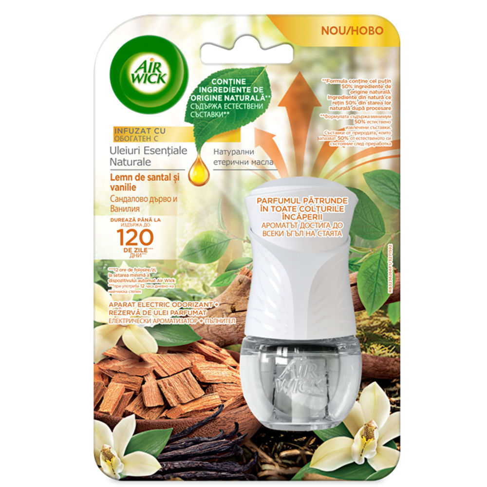 Noile arome Air Wick Light & Fresh au fost special concepute pentru a oferi o experienta subtila de parfumare. Aroma este cu 30% mai delicata decat parfumurile obisnuite ale odorizantelor electrice Air Wick. Noua formula de uleiuri esentiale contine ingrediente de origine naturala* si este imbogatita cu uleiuri esentiale naturale.