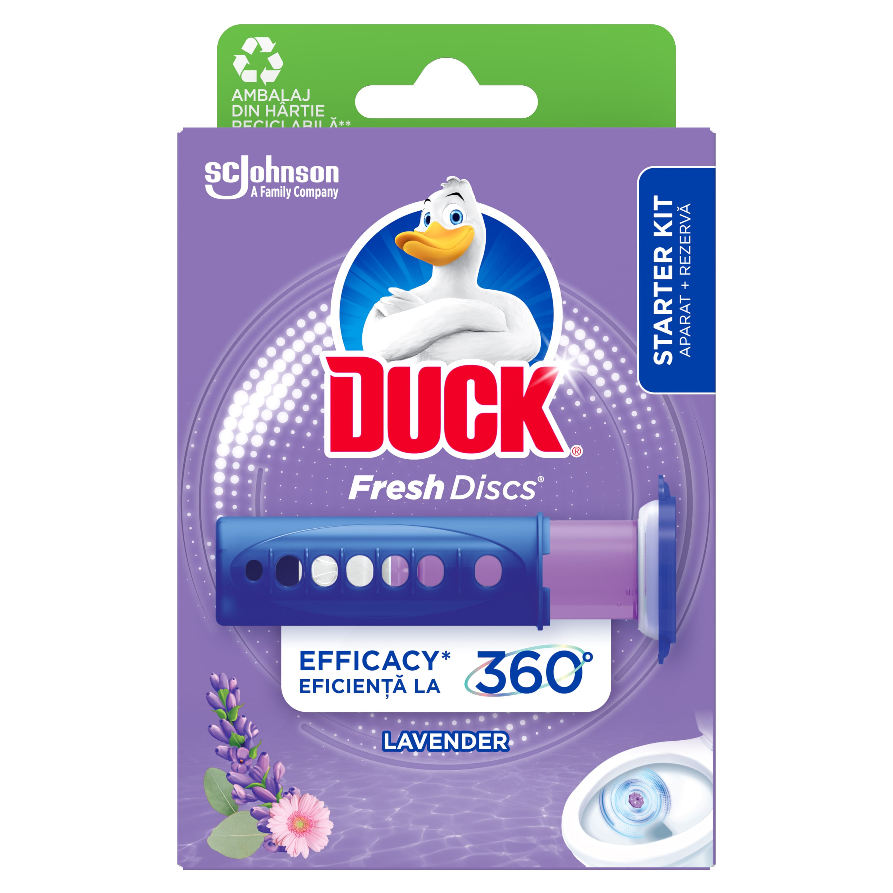 Odorizant pentru toaleta Duck Fresh Discs cu parfum de lavanda, previne depunerea de calcar. Avertismente: H412 Nociv pentru viata acvatica, avand efecte de lunga durata.