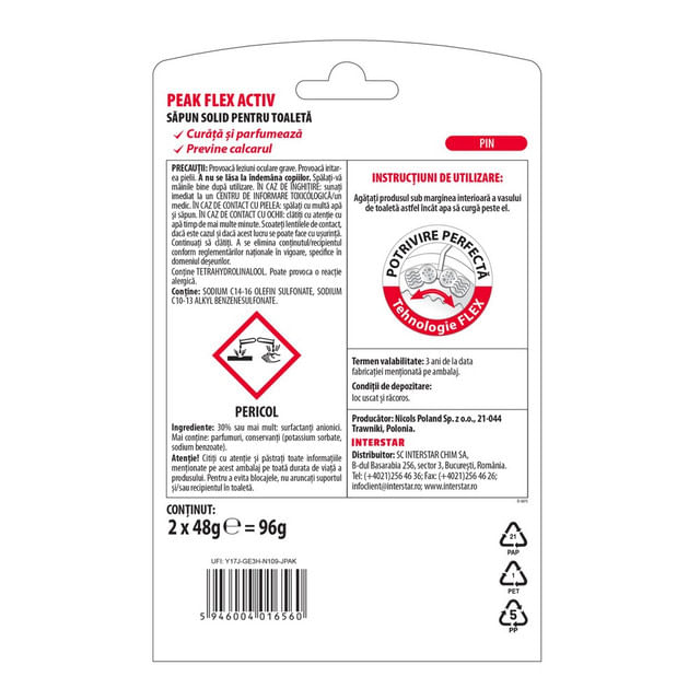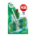 Peak FLEX ACTIV este un odorizant solid de toaleta ce confera o curatenie impecabila, datorita spumei bogate. Produsul igienizeaza toaleta, o parfumeaza intens, neutralizeaza mirosurile neplacute si previne depunerile de calcar, conferind o stralucire de durata. Tehnologia Flex asigura o potrivire perfecta pe marginea vasului de toaleta.