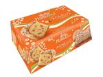 Faina de grau, coaja de portocala confiata 13% (coaja de portocala, sirop de glucoza-fructoza, zahar), glazura 10% (zahar, faina de orez, ulei de floarea-soarelui, pudra de albus de ou, arome), zahar, margarina (grasime de palmier, apa), maia 5% (faina de grau, apa), zahar granulat 4,5%, galbenus de ou, emulsificatori: mono- si digliceride ale acizilor grasi*; sare, unt, lapte praf degresat, arome.