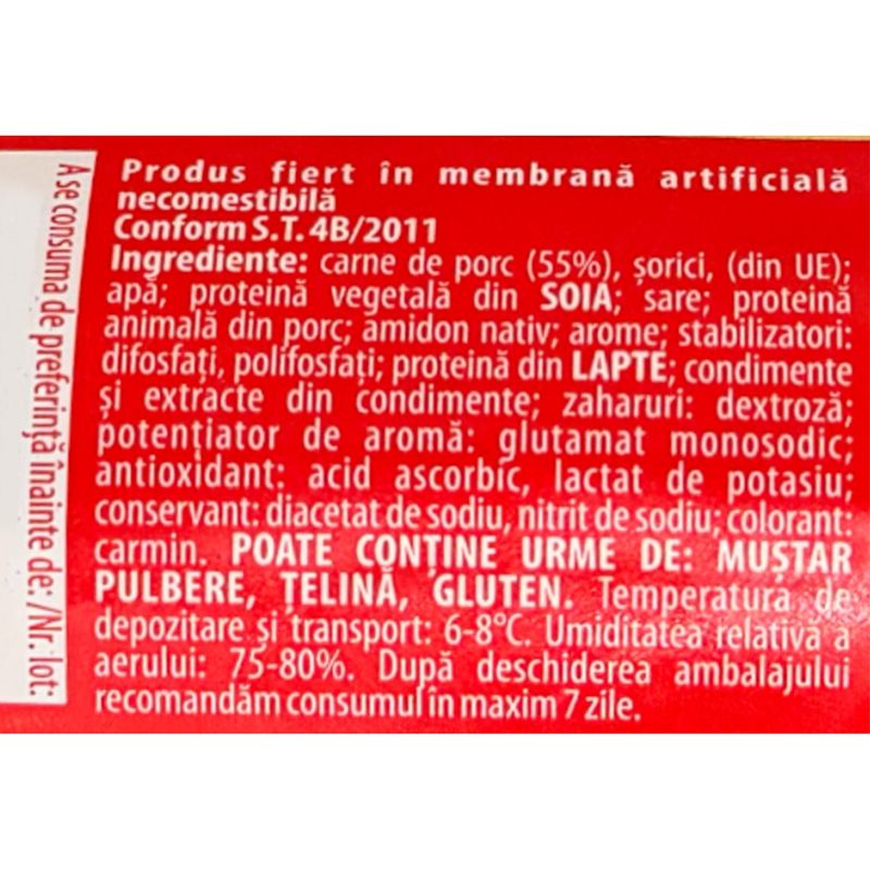 carne de porc (55%), sorici, (din UE); apa; proteina vegetala din SOIA; sare; proteina animala din porc; amidon nativ; arome; stabilizatori: difosfati, polifosfati; proteina din LAPTE; condimente si extracte din condimente; zaharuri:dextroza; potentiator de aroma: glutamat monosodic; antioxidant: acid ascorbic, lactat de potasiu; conservant: diacetat de sodiu, nitrit de sodiu; colorant: carmin.