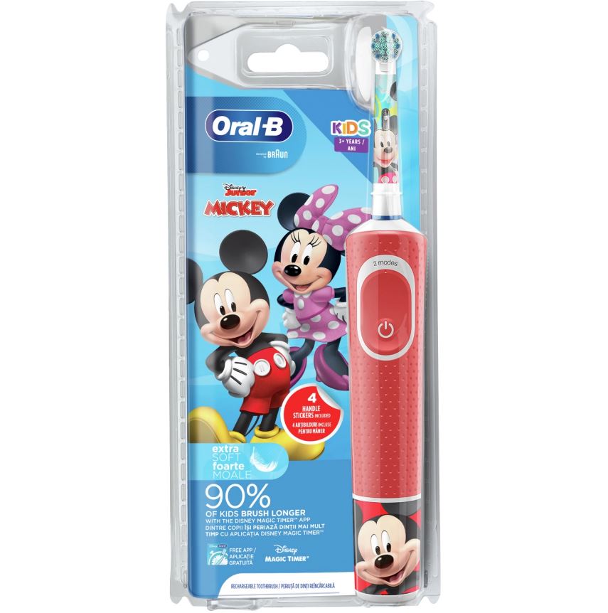 Setul include: o periuta de dinti electrica, un incarcator, 1 cap Oral-B original, 4 autocolante pentru o periuta de dinti Mickey.