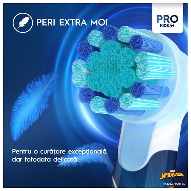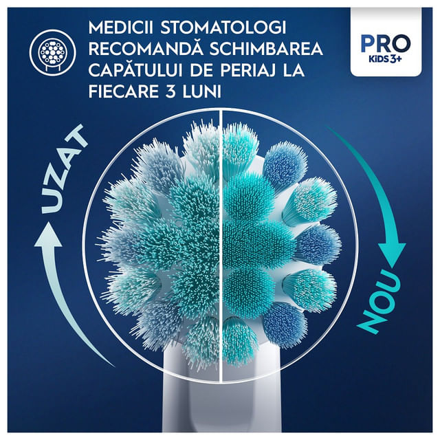 • Periuta de dinti electrica Oral-B Pro Kids recomandata de medicii dentisti pentru varste de peste 3 ani, ofera o curatare delicata si eficienta.