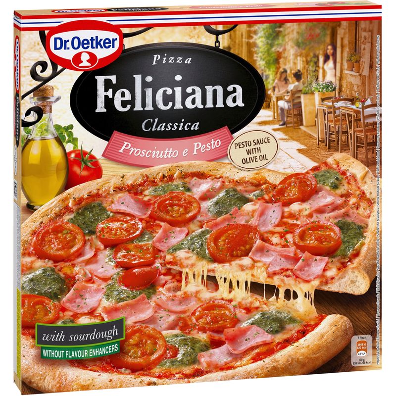 Pizza Dr. Oetker Feliciana Prosciutto e Pesto este un sortiment original cu sunca si sos tipic italian – sos pesto verde.