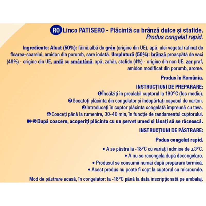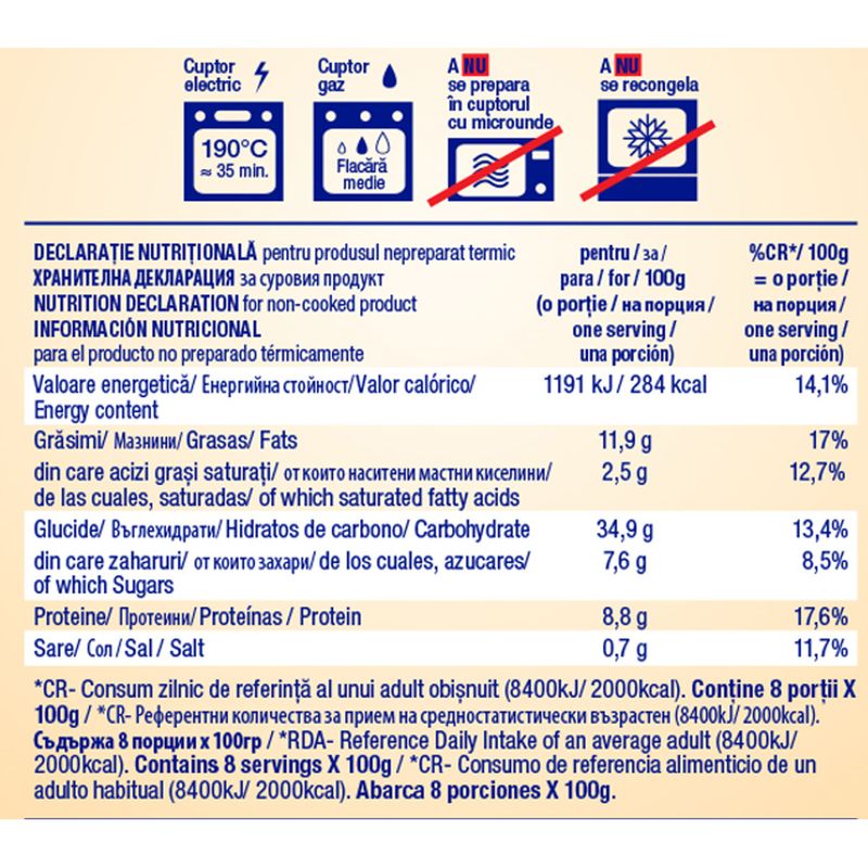 A nu se recolgela dupa decongelare. Produsul se consuma numai dupa prepararea termica. A nu se coace in cuptorul cu microunde.