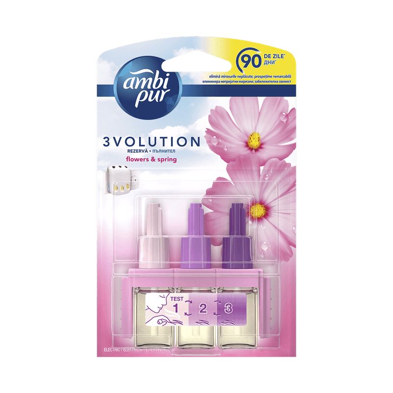 Ambi Pur 3Volution odorizant electric de camera contine 1 rezerva parfum Flowers & Spring.Odorizantele electrice Ambi Pur 3Volution sunt ca o gura de aer proaspat pentru casa ta. Nasul nostru se obisnuieste rapid cu mirosurile, fie ele placute sau neplacute, si astfel incetam sa le mai observam. Cu Ambi Pur 3Volution, nu doar acoperi mirosurile neplacute, le elimini complet si le inlocuiesti cu 3 arome complementare ce alterneaza intre ele pentru a asigura o prospetime permanenta. Trebuie doar sa il bagi in priza, sa ajustezi difuzorul la intensitatea preferata si apoi te vei bucura de prospetimea fiecaruia dintre cele 3 parfumuri o data la fiecare 45 de minute. Dureaza pana la 90 de zile, mentinandu-si aceasi intensitate a parfumului pana in ultima zi.