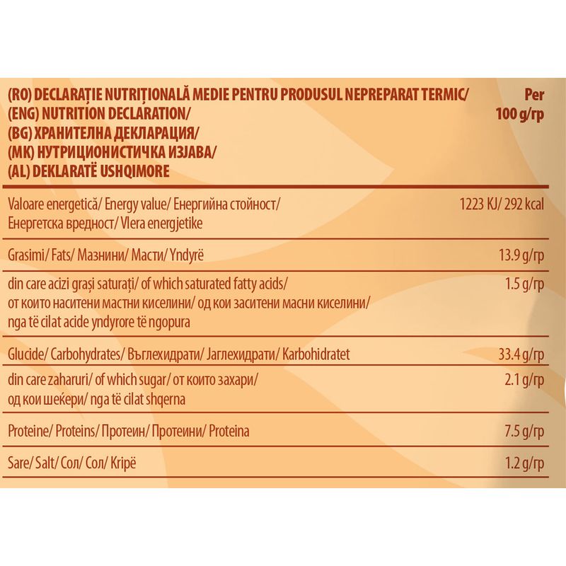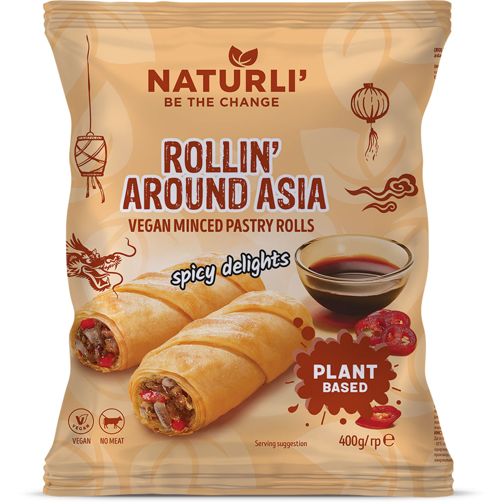 Umplutura (40%): tocata pe baza de soia [apa, proteina de soia -3% (origine din afara UE), ulei vegetal de rapita, ceapa, sare, condimente, extract de mere, aroma naturala, stabilizator (metil celuloza)], apa, ardei cuburi, preparat pe baza de soia [ apa, zahar, sos de soia (contine grau), melasa, sare, sirop de artar, amidon modificat, corectori de aciditate (acid lactic, acid citric), conservanti (sorbat de potasiu, benzoat de sodiu)], ceapa, gris din grau, amidon din porumb, ulei de masline din turte de masline, sare, chilli, ghimbir.