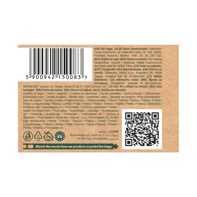 Amenintarea pentru mediu nu este plasticul in sine, ci doar o lipsa de cunostinte despre cum sa-l gestionezi si sa-l reprocesezi bine. Aceasta idee a dat nastere pungilor de gunoi din seria For Nature, care au fost obtinute din deseuri de plastic reciclate, fara adaugarea de coloranti sau parfumuri. 100% reciclabil. Rola contine 20 bucati.