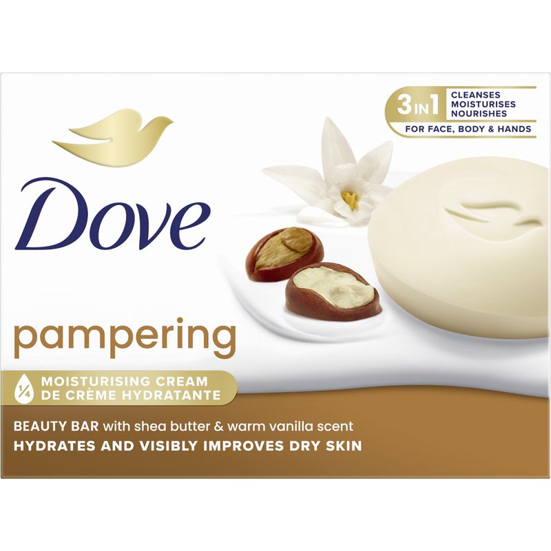 Sapun-crema pentru infrumusetare Dove Pampering cu unt de shea si vanilie. Pentru o piele frumoasa si catifelata alege sapunul-crema Dove pentru fata, maini si corp.