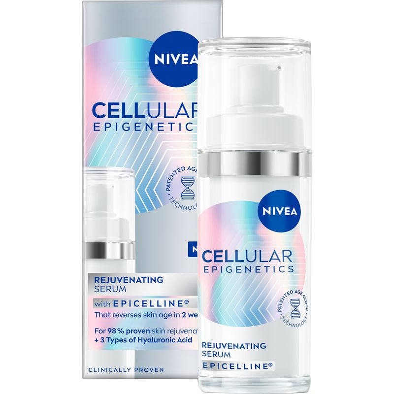 Serumul Cellular Epigenetic pentru revitalizarea pielii este un serum eficient care ofera pielii un aspect mai luminos, mai ferm si mai tanar. NIVEA a descoperit ingredientul activ Epicelline®, o inovatie in stiinta epigeneticii, care inverseaza varsta pielii prin reactivarea functiilor tinere ale celulelor pielii. Este demonstrat stiintific prin tehnologia patentata Age Clock® ca serumul inverseaza varsta pielii in doar 2 saptamani.
