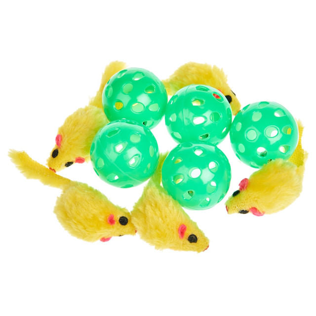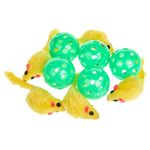 Set de 10 jucarii compuns din 5 soareci cu dimensiunea de 6 cm si 5 mingi cu dimensiunea de 4 cm.