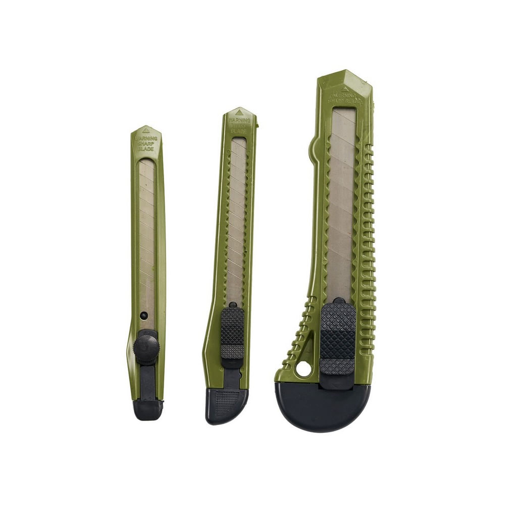 Set format din 3 cuttere verzi HEINNER, cu lame de dimensiuni standard si ergonomice datorita formelor sale. Dimensiuni lame: 9/9/18 mm.