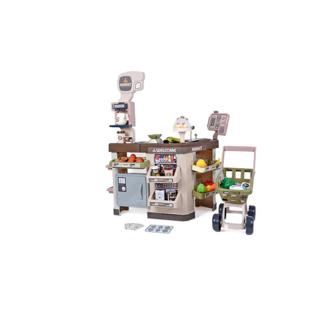 Setul include 64 de piese — de la supermarketul în sine cu un aparat de cafea până la un cărucior, cești, produse și bani. Un copil își poate amenaja un adevărat mini-magazin acasă, combinând produse și creând propriile scenarii de joc. Datorită dimensiunii convenabile, toate elementele se așează cu ușurință pe suprafața de joc, iar căruciorul face jocul mobil. Setul este fabricat din plastic de înaltă calitate, sigur pentru copii, ceea ce garantează durabilitate și utilizare confortabilă.