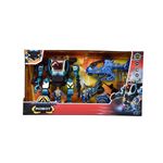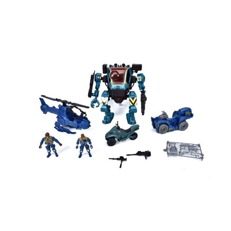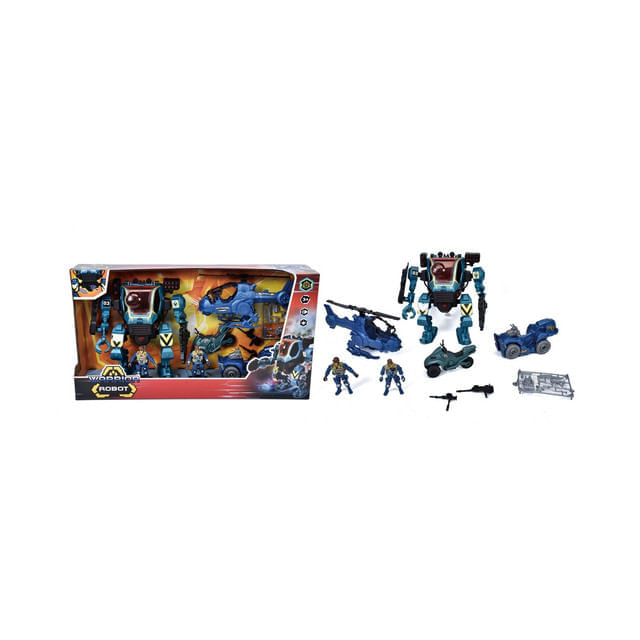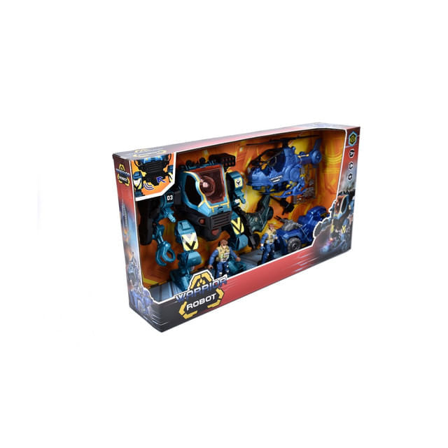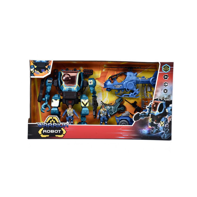 One Two Fun - Set razboinic; Vârsta 3+; Total 9 piese: 1 robot, 2 războinici, 1 set arme, 2 pistoale, 1 elicopter, 1 motor, 1 motor transformabil; Dimensiune robot: 25 x 11 x 26cm, elicopter: 24 x 13.5cm, motor: 13.5 x 7cm, motor transformabil: 17 x 9cm; Dimensiune ambalaj: 57 x 12 x 31 cm; Funcții: lumină & sunet; Baterii: 2 x AG13 incluse