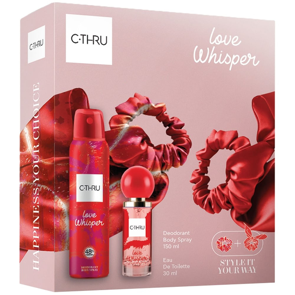 Imparte bucuria sarbatorilor cu cei dragi oferindu-le setul cadoul C-THRU LOVE WHISPER. Pachetul este format din apa de toaleta C-THRU Love Whisper, deodorant spray pentru corp C-THRU Love Whisper + elastice par.