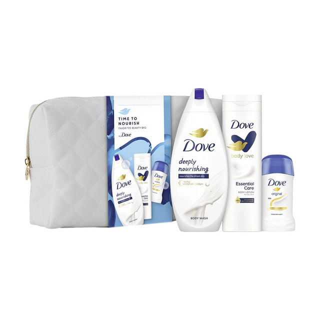 Set pentru cadou Dove: Gel de dus Deeply Nourishing, 250 ml + Deodorant stick, 50 ml + Lotiune corp, 250 ml + geanta Set pentru cadou Dove: Gel de dus Deeply Nourishing, 250 ml + Deodorant stick, 50 ml + Lotiune corp, 250 ml + geanta