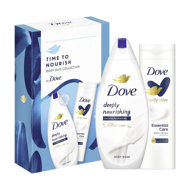 Set pentru cadou Dove: Gel de dus Deeply Nourishing, 250 ml + Lotiune corp Essential Care, 250 ml Set pentru cadou Dove: Gel de dus Deeply Nourishing, 250 ml + Lotiune corp Essential Care, 250 ml