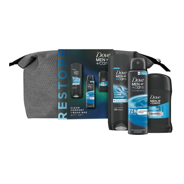 Set pentru cadou Dove Men Care Clean Comfort: Gel de dus, 250 ml + Deodorant spray, 150 ml + Deodorant stick + geanta
