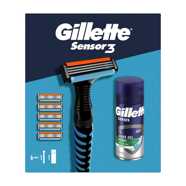 Set pentru cadou Gillette Sensor3: Aparat de ras + 5 Lame de rezerva + Gel de ras Sensitive, 75 ml - Comanda online acum