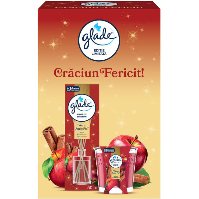Set pentru cadou Glade Warm Apple Pie & Cinnamon: lumanare parfumata, 112 g + parfum de camera cu betisoare, 50 ml - Comanda online acum