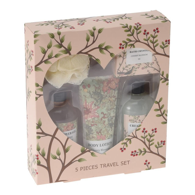 Set pentru cadou Koopman Cherry Blossom: Gel de dus, 265 ml + Crema baie, 265 ml + Lotiune corp, 155 ml + Sare baie, 50 g + Burete baie - Comanda online acum
