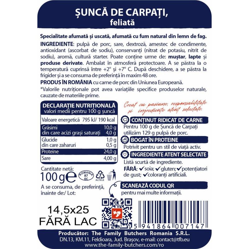 Sunca de Carpati este o specialiate crud-uscata afumata cu fum natural din lemn de fag si preparata cu grija din pulpa de porc de calitate superioara. Cu un gust indens si o textura fina, este alegerea ideala pentru platouri, gustari rafinate si chiar salate. Pentru 100g de produs se folosesc 129g pulpa de porc.
