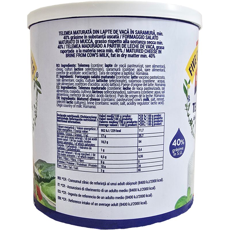 Telemea (Lapte de vaca pasteurizat, sare, cheag, culturi lactice), saramura (apa, sare, corector de aciditate: acid lactic)
