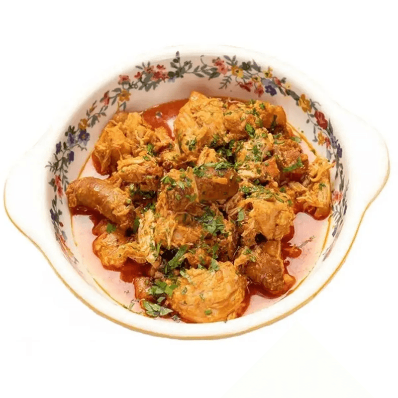 sos de rosii (rosii feliate, pasta de rosii, ulei vegetal de floarea soarelui, zahar), pulpe de pui, vin alb (contine SULFITI ), carnati oltenesti [carne porc (90%), apa, sare, stabilizatori: E450, antioxidant: E300, arome naturale, condimente (contin MUSTAR), zaharuri (dextroza), proteina animala din porc, usturoi, colorant (carmine), conservant: E250), ulei vegetal de floarea soarelui, pulpa de porc, cotlet de porc, kaizer (piept de porc, apa, sare, proteina vegetala din SOIA, proteine animale (porc, LAPTE ), zaharuri (dextroza, glucoza), stabilizatori: E450, E451, antioxidant: E325, condimente si extracte de condimente, extracte de legume, usturoi, agent de ingrosare: E407, antioxidant: E301), ceapa, apa, patrunjel, usturoi, sare, boia dulce, cimbru, piper negru boabe.
