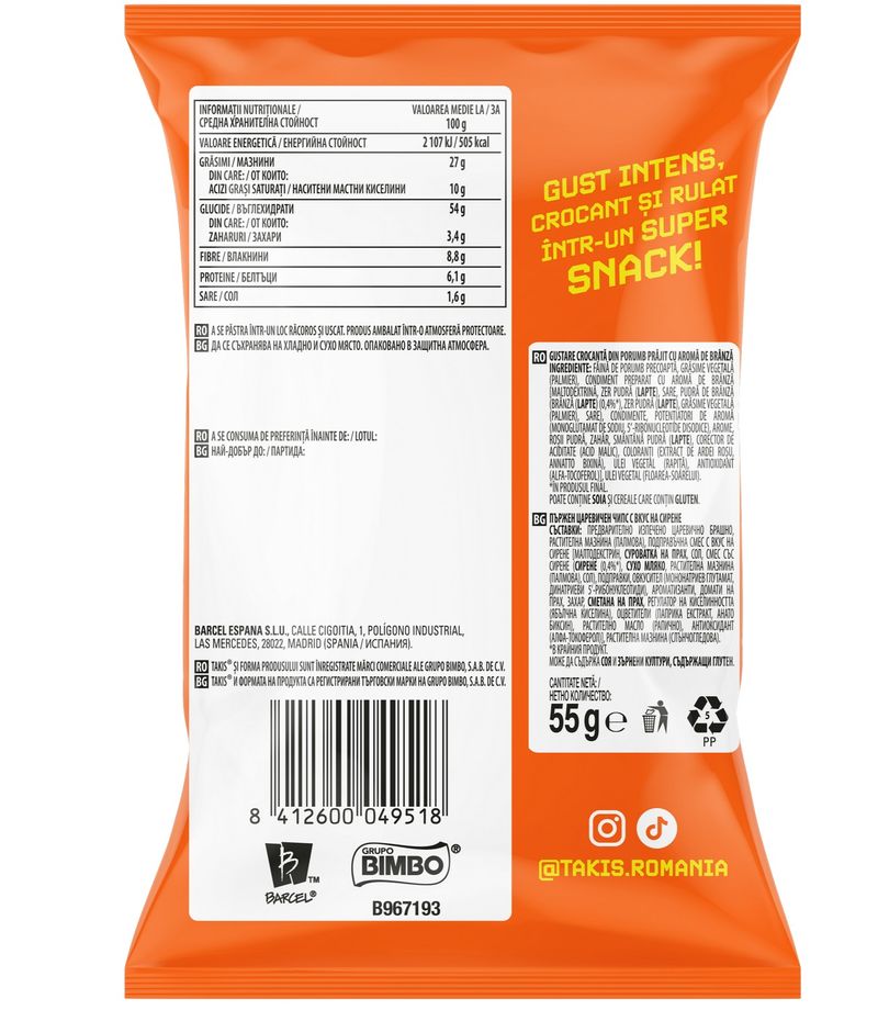 Faina de porumb precoapta (65%), grasime vegetala (palmier), condiment preparat cu aroma de branza [maltodextrina, zer pudra (lapte), sare, pudra de branza (branza (lapte) (0,4%)*, zer pudra (lapte), grasime vegetala (palmier), sare), condimente, potentiatori de aroma (monoglutamat de sodiu, 5′-ribonucleotide disodice), arome, rosii pudra, zahar, smantana pudra (lapte), corector de aciditate (acid malic), coloranti (extract de ardei rosu, annatto bixina), ulei vegetal (rapita), antioxidant (alfa-tocoferol)], ulei vegetal (floarea-soarelui). *in produsul final. Poate contine soia si cereale care contin gluten.