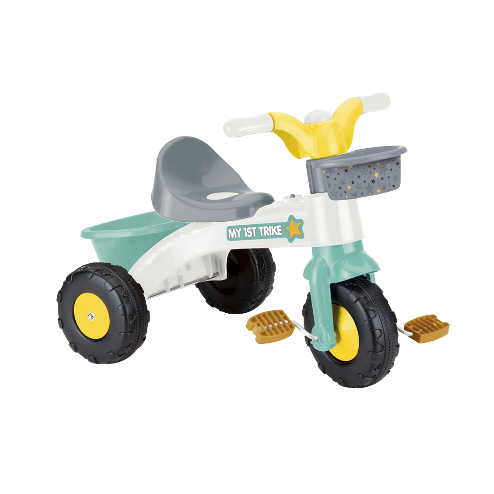 Caracteristici: tricicleta este realizata din plastic de inalta calitate, oferind rezistenta indelungata poate rula atat in fata, cat si in spate prevazuta cu: cosulet atat in partea din fata, cat si in spate, pedale pe roata din fata, claxon si cheita ce se rasuceste, pentru dezvoltarea indemanarii