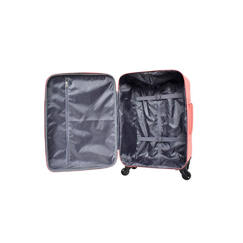 Troler confectionat din material textil, inaltime 70 CM, cu o compartimentare eficienta, ce iti permite transportul bagajelor in siguranta. Compartimentul principal, captusit la interior, este suficient de incapator pentru hainele tale, iar buzunarul cu fermoar este ideal pentru lucrurile marunte. Curelele interioare vor securiza bagajul pe perioada transportului. Dotat cu 4 roti , cu rotire 360°, asigura o manevrare usoara. Trolerul se inchide cu fermoar.