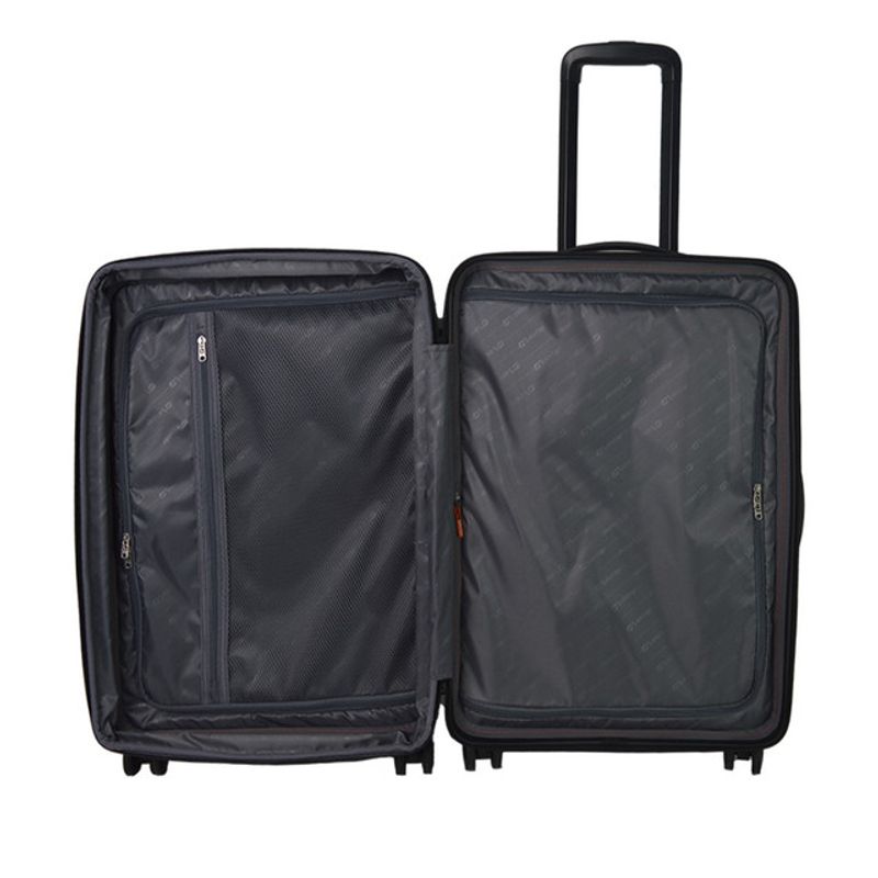 Material ABS. Dimensiune 35x20x55 cm, greutate 2.6 kg, volum 30 L. Trolley interior din aluminiu. 8 roti universale silentioase. Manere plastic sus si lateral. Lacat TSA. Neextensibil. Captuseala poliester 210D. Logo placa metalica Airport. Eticheta ID: da. Interior: 2 compartimente cu fermoar tip U + 1 buzunar plasa + captuseala detasabila reparabila.