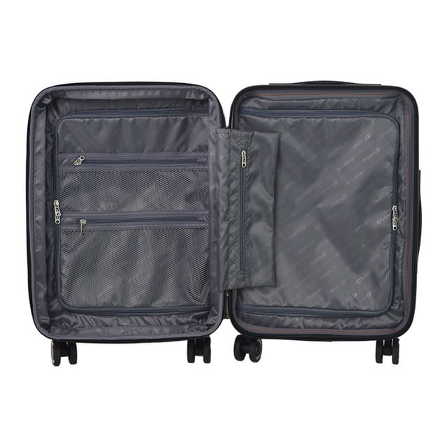 Material 100% policarbonat. Dimensiune 35x23x55 cm, greutate 2.6 kg, volum 35 L. Trolley interior din aluminiu. 8 roti universale silentioase. Manere plastic sus si lateral. Lacat TSA incorporat. Fermoar principal YKK #8. Extensibil. Captuseala poliester 210D. Logo placa metalica Airport. Eticheta ID pe trolley. Interior: 2 compartimente tip U + 2 buzunare plasa + buzunar central + captuseala detasabila reparabila. Cadou: 4 saci de organizare.