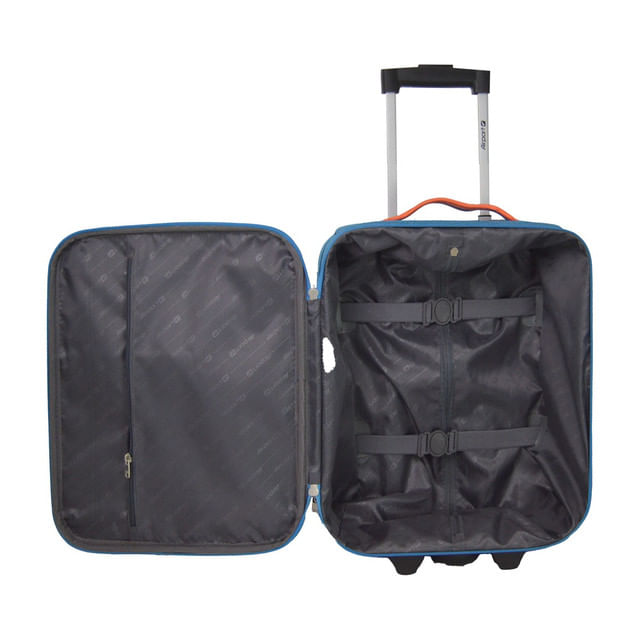 Troler compact din poliester 600D cu EVA, căptușeală 210T imprimată. Fără lacăt (model XS). Sistem trolley interior cu buton, mâner superior, 2 roți. Fermoare nylon rezistente cu puller metalic. Interior cu buzunar și curea elastică de fixare.