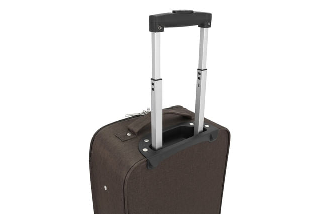 Troler textil two-tone din poliester cu EVA, rezistent și flexibil. Sistem trolley dublu metalic cu buton. Lacăt cu cifru lateral. Interior căptușit 210D cu imprimeu Airport, buzunar pe capac și 2 curele elastice de fixare.