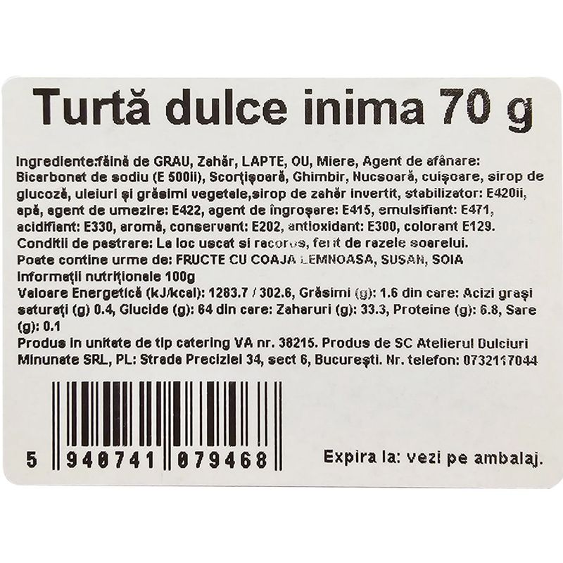 Turta dulce Dulciuri minunate, forma inima, 70 g, diverse mesaje Turta dulce Dulciuri minunate, forma inima, 70 g, diverse mesaje