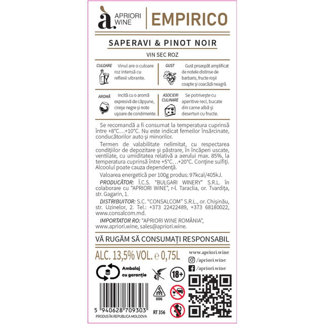 Vin rose sec Apriori Empirico, Saperavi si Pinot Noir, 0.75 l
