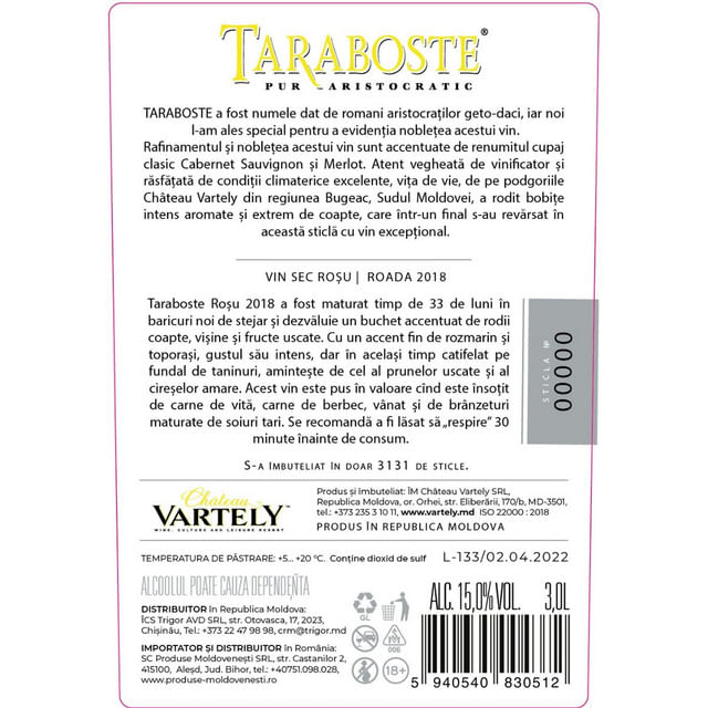 Vin rosu sec Chateau Vartely Taraboste, Cabernet Sauvignon si Merlot, Magnum, 3 l + cutie Vin rosu sec Chateau Vartely Taraboste, Cabernet Sauvignon si Merlot, Magnum, 3 l + cutie