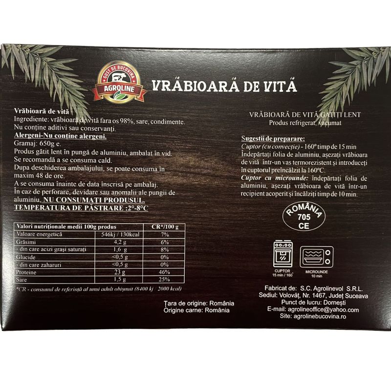 Vrabioara de vita fara os proaspata, se taie in bucati de 650g, se asezoneaza cu sare si condimente dupa care se videaza in pungi de aluminiu (polilaminate) care se supun tratamentului termic de fierbere. Ulterior, produsul se impacheteaza in cutii din carton, care apoi se paletizeaza in vederea depozitarii si livrarii. A se consuma de preferinta in stare calda.